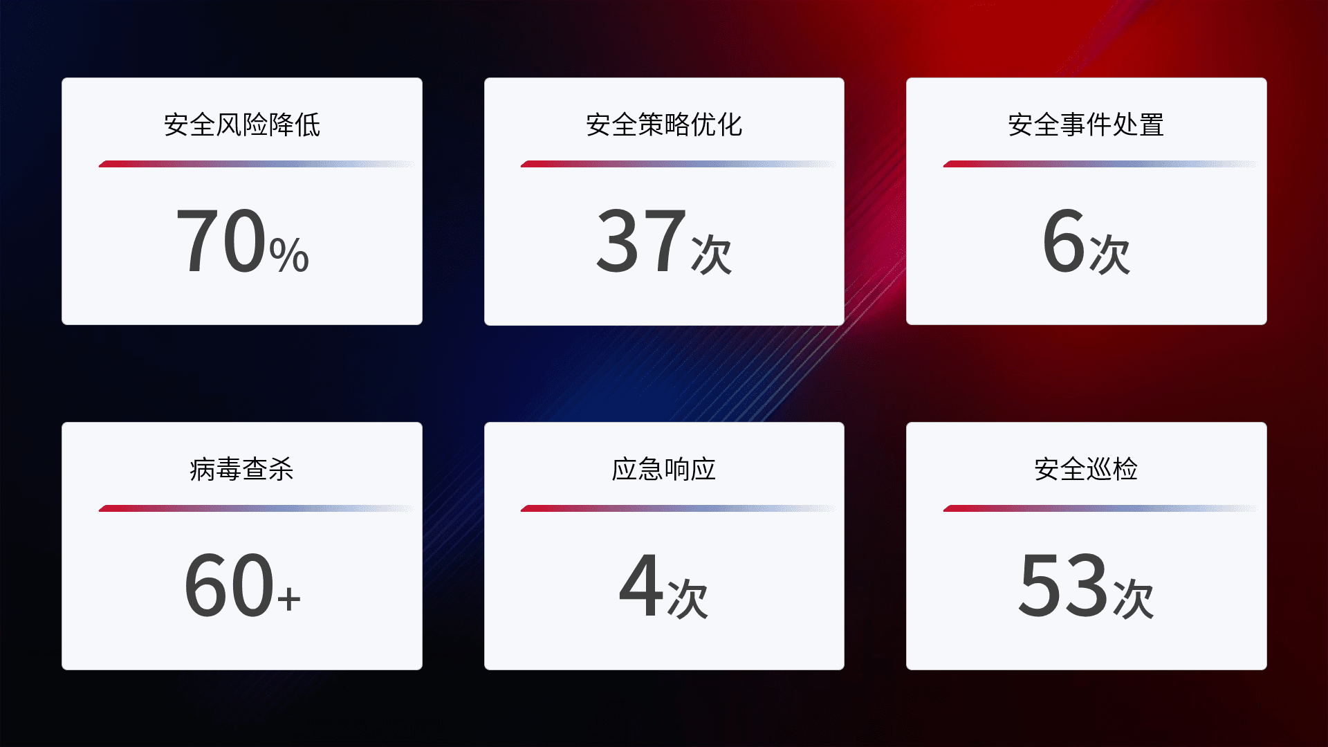 提供全面的安全事件报告体系,,,,包括处置报告、、、、周报、、季度和年度总结,,结合持续监控,,,帮助客户深入了解网络安全状况。。。。